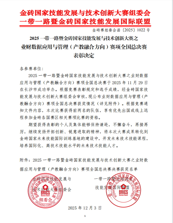 近日,2025一带一路暨金砖国家技能发展与技术创新大赛之业财数据应用与管理(产教融合方向)赛项全国总决赛在湖南商务职业技术公司圆满落幕。太阳成集团tyc太阳成集团派出康蕊、赵甘露、王子怡、杨黎敏及赵思甜、孟琬、杨殿杰、钱卓亚8名同学组成的两支参赛团队表现亮眼,凭借扎实的专业功底和默契的团队协作,从众多参赛队伍中脱颖而出,双双斩获高职组三等奖,为公司赢得了荣誉。
