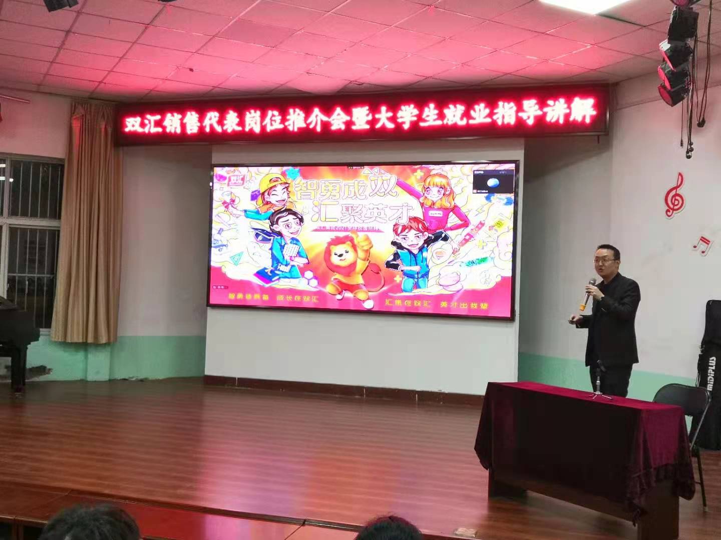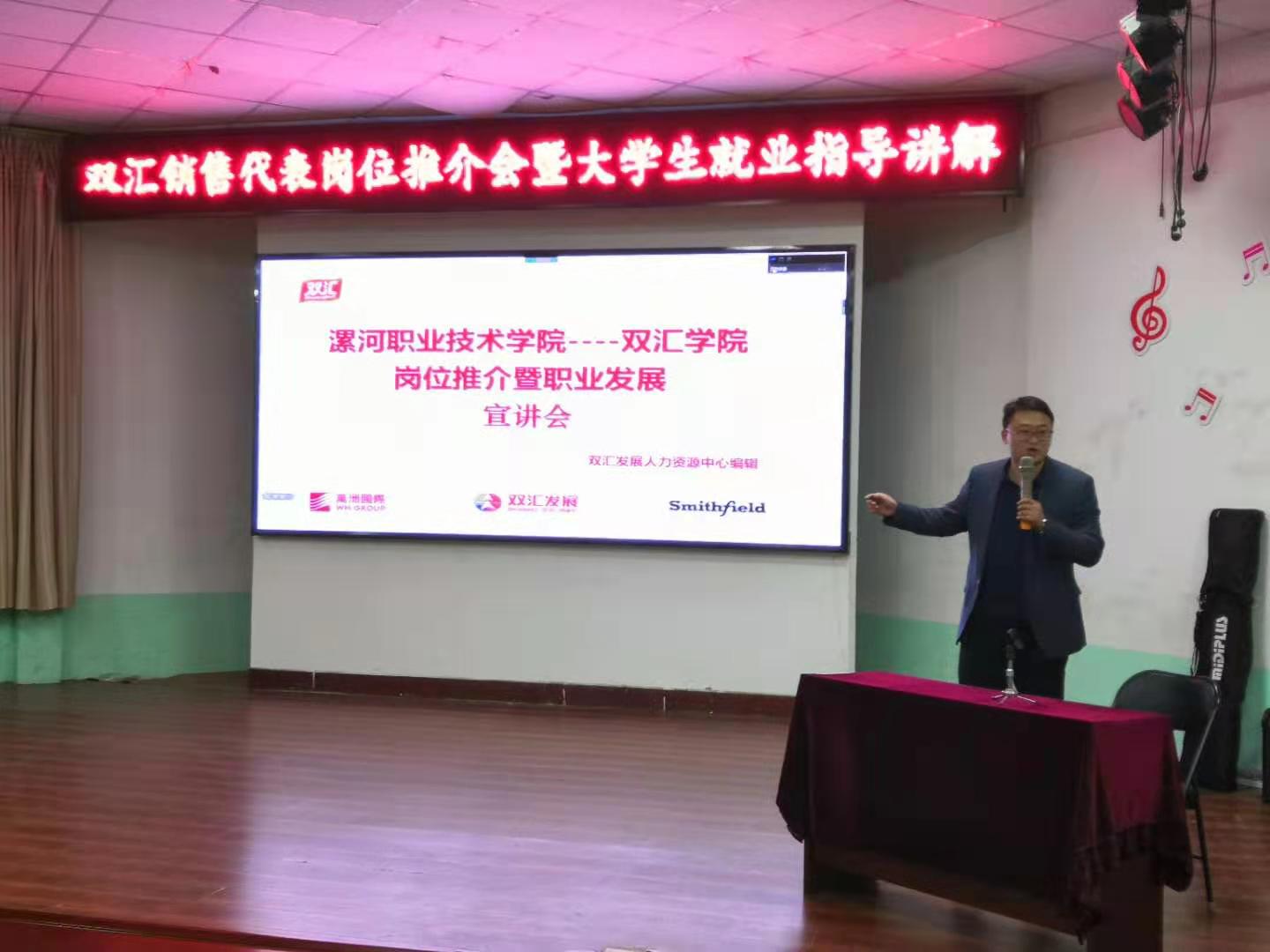 3月24日晚上,双汇集团人力资源部副总潘硕在小礼堂为200多名在校生,做了双汇销售代表岗位推介会暨老员工就业指导讲解。双汇公司党总支书记张改亮主持。