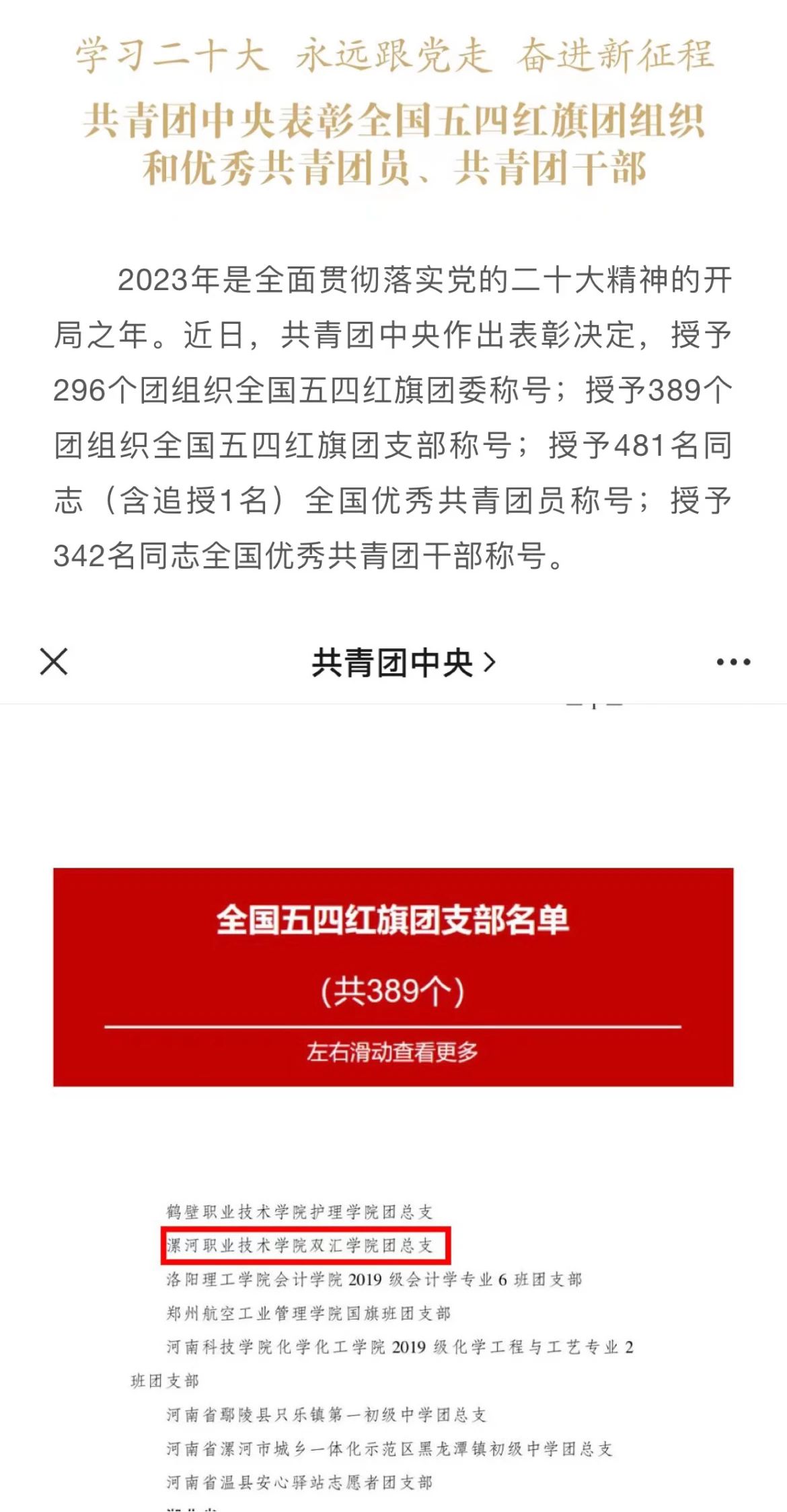 2023年是全面贯彻落实党的二十大精神的开局之年。近日,共青团中央作出表彰决定,授予296个团组织全国五四红旗团委称号;授予389个团组织全国五四红旗团支部称号;授予481名同志(含追授1名)全国优秀共青团员称号;授予342名同志全国优秀共青团干部称号。太阳成集团tyc双汇公司团总支荣获“全国五四红旗团支部”荣誉称号,这是共青团中央授予全国基层团组织的最高荣誉。