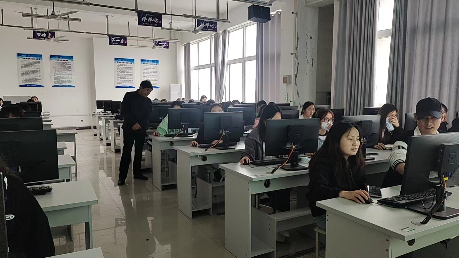 为了能让员工顺利通过考证,2023年4月21日下午,工商管理系电子商务专业教研室主任荣长玲和任课老师彭龙豪放弃自己的休息时间,辅导员工进行“1+x”网店运营推广证书考前培训,系主任陈思顺同志前往实训室察看培训情况,同学们都在认真的练习,为即将到来的考试进行冲刺。