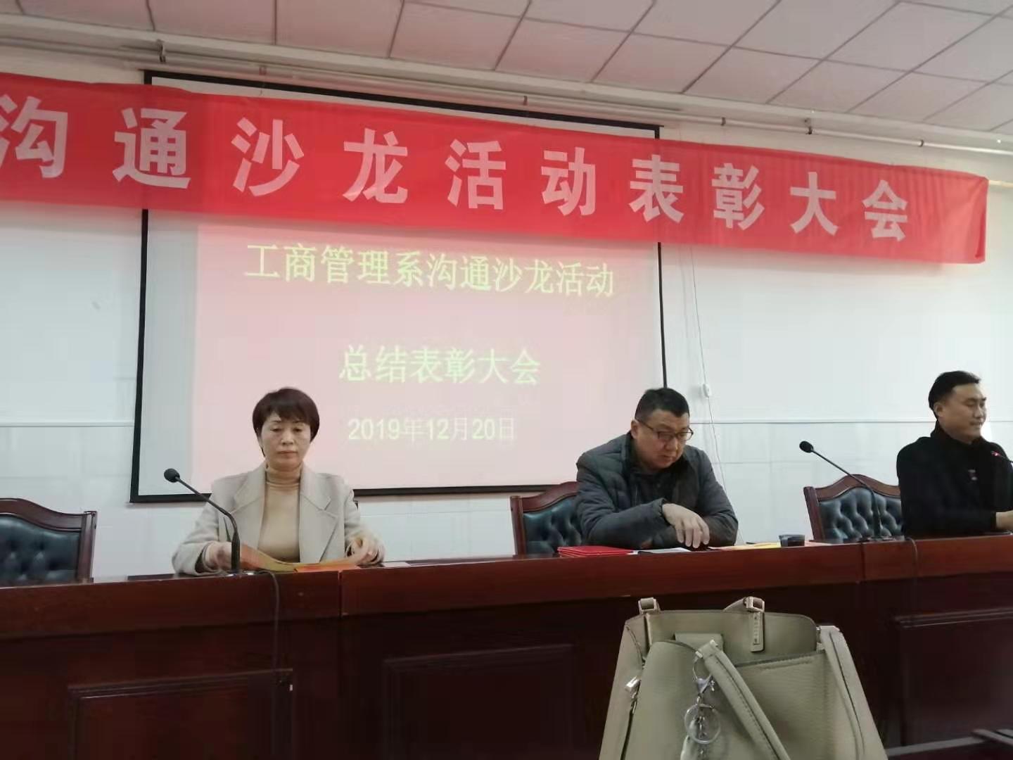 2019年12月20日下午,工商管理系在公司3101会议室举办了2019-2020学年第一学期沟通沙龙活动总结表彰大会,工商管理系领导班子成员和2019级各专业员工参加总结表彰大会,大会由系团总支书记赵秋涛主持。