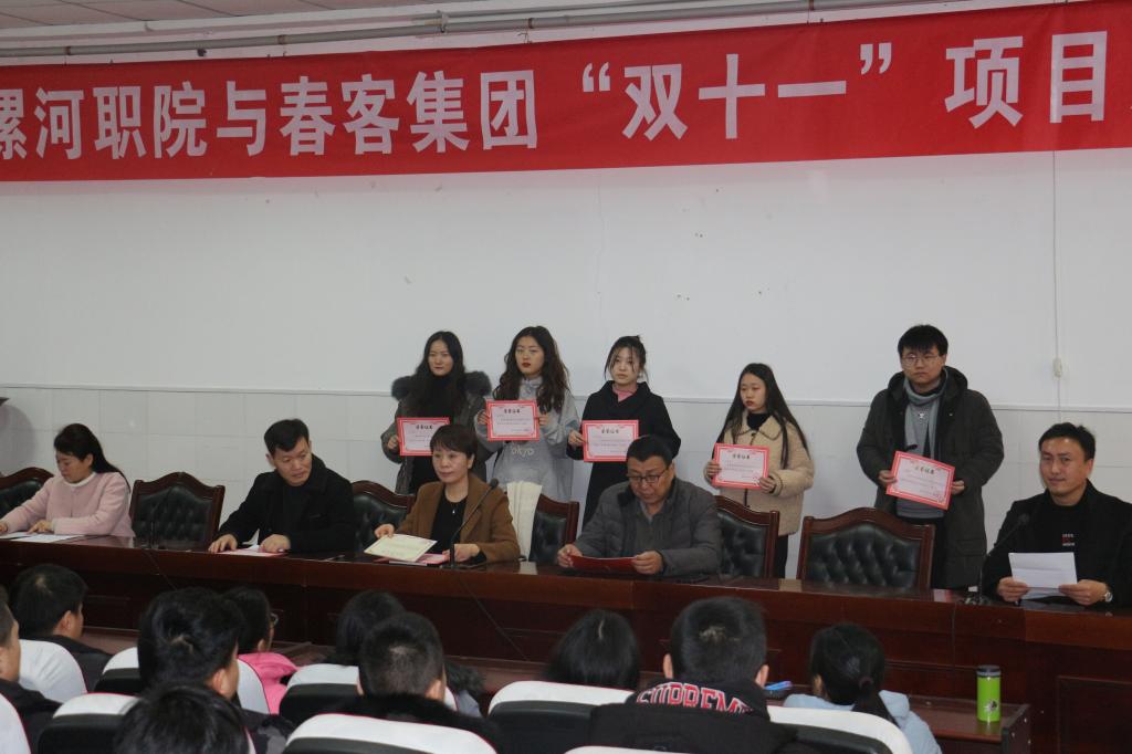 在这次表彰大会上,首先由系学管副主任闫建伟宣读了表彰决定,对在这次项目工作中表现突出的同学进行表彰,其中郭洋美、叶丽杰、刘舒畅等20名同学获得绿卡奖,周毅、冯雨蒙、王盼盼等9名同学获得优秀奖。其中获得绿卡奖的同学将获得企业通行证,将来可以免试到春客集团进行实习工作,获得优秀奖的同学将来到春客集团参加实习工作时则会被优先录用。接着系领导为获得奖励的同学进行颁奖。之后由王孟丹、陈小春、赵洁琦等三位员工代表上台发言,把自己的工作心得和体会与大家进行了分享。
