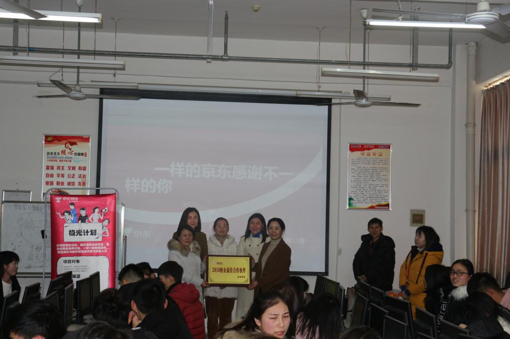 在这次总结会上,京东人资代表刘学强首先就同学们在2018年度“京东好物节”期间的表现进行了总结,对同学们的付出表示了感谢。接着他代表京东仓储部对此次实现中表现优异的员工和指导教师进行了表彰,共有五名同学获得优秀实习生,刘芳芳、赵艳玲则获得了先进指导教师,同时授予公司为“京东2018校企最佳合作伙伴”。