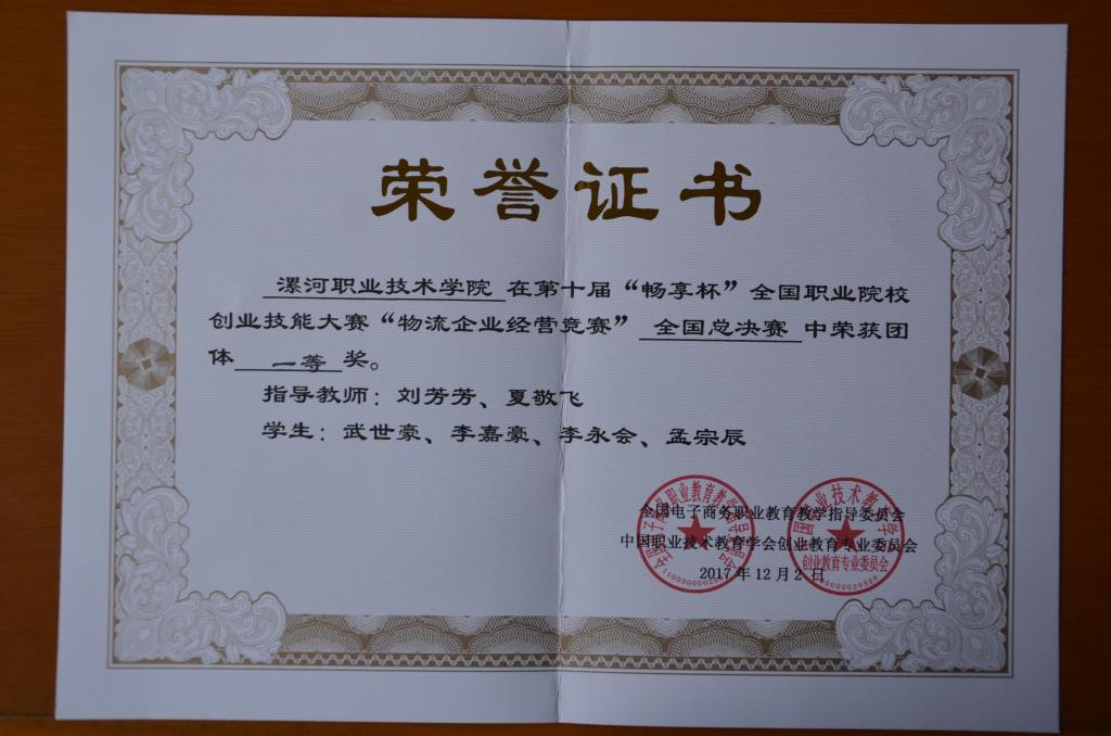 2017年12月2日,第十届“畅享杯”全国职业院校创业技能大赛暨物流企业经营技能竞赛全国总决赛在湖北武汉举行。公司工商管理系荣获团体一等奖一项,三等奖一项,再次展现了公司物流管理专业的办学实力。
