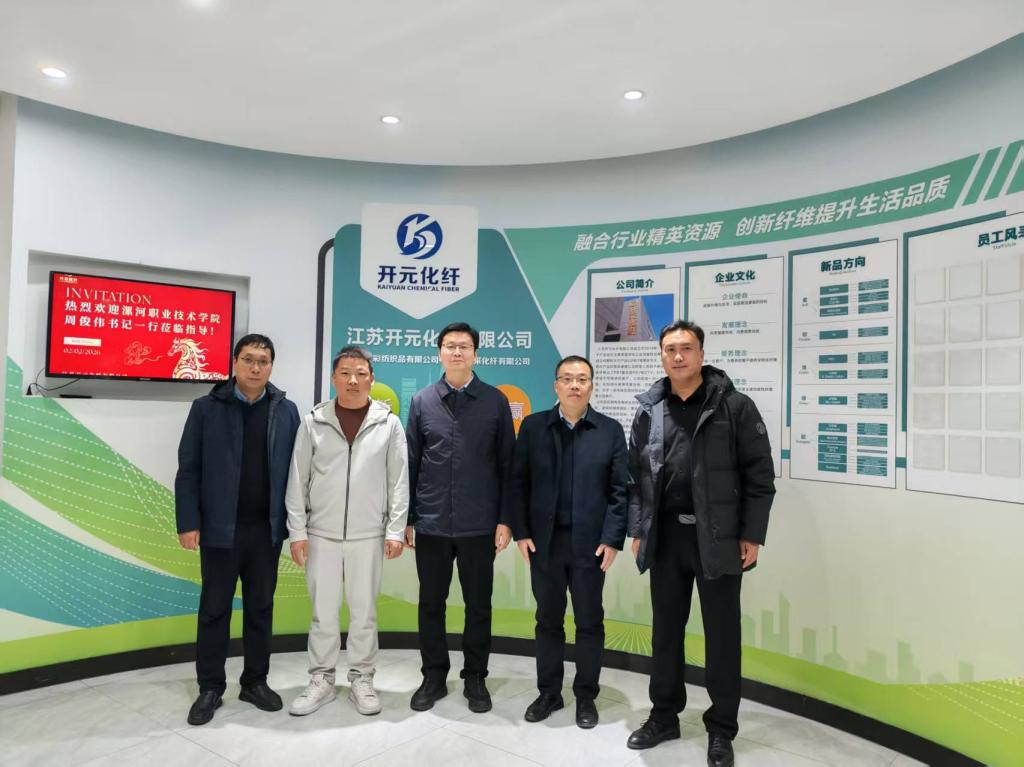 在江苏开元化纤有限公司,总经理、优秀员工李军社向母校老师介绍了公司的发展历程、核心业务、取得的建设成果,并表达了对母校的深厚感情,感恩母校的栽培,建议公司加强毕业生实践技能培养和底线思维,强化与企业的合作,不断提升毕业生职业素养。周俊伟对员工的热情接待表示衷心的感谢,对员工的成就倍感欣慰和自豪。他表示,公司近几年规模不断发展壮大,实力不断增强,正在大力开展校企合作和产教融合,希望员工们一如既往关注关心母校,广泛向社会宣传集团,积极为毕业生高质量充分就业和集团发展建设献计献策,祝愿员工们事业越来越红火,家庭越来越幸福。